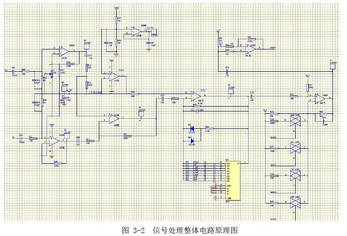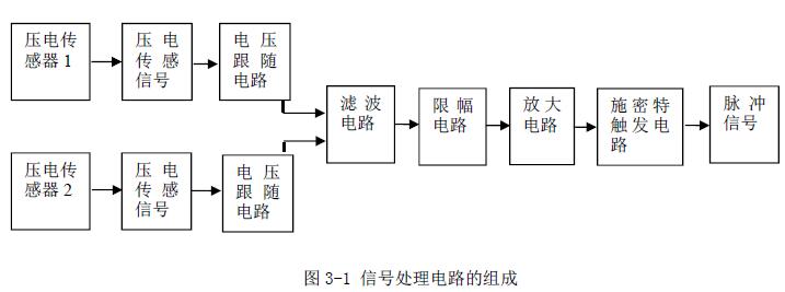 为了能更好的检测到旋进旋涡进动频率信号,本文设计了一套信号处理电路。该电路能更好的将压电传感器检测到的压电电信号整理为与流量呈线性关系的漩涡脉冲信号。这个整理好的脉冲信号可直接接到单片机具有中断功能的引脚上,通过中断功能对其进行计数、计频。如下图3-1 所示信号处理电路的构成,双路压电信号采集经过差分放大电路、限幅电路、放大电路以及施密特触发电路。如图3-1 为硬件电路结构图,图3-2 为压电信号处理电路原理图。