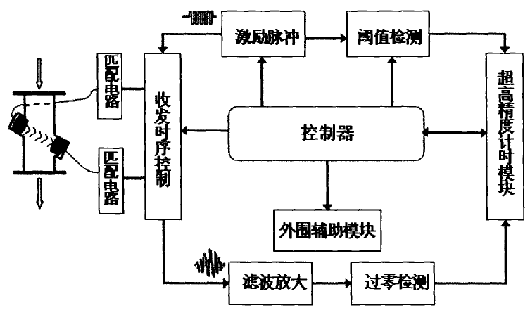 接收换能器接收到由发射换能器发出的超声波信号后,产生一个响应电信号,我们称该电信号为接收信号,将其进行滤波放大,使得信号稳定,而且幅值符合测量要求,然后经过零检测模块处理后确定接收换能器接收到信号的时刻,同时山计时模块记录下该时刻,这样就得到了信号的接收时刻.