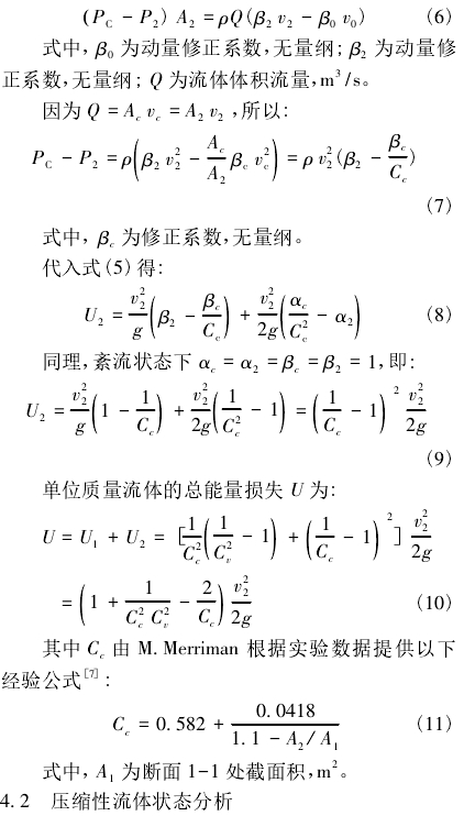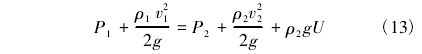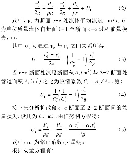 式中,α1为动能修正系数,无量纲;v1为断面1-1处流体平均流速,m/s;P1为断面1-1处流体静压,N/m2;α0为动能修正系数,无量纲;v0为断面c-c处流体理想平均流速,m/s;PC为断面c-c处流体静压,N/m2;ρ为流体密度,kg/m3;g为重力加速度,N/kg或m/s2。
