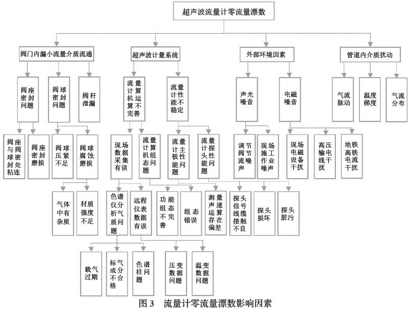 西气东输对流量计的切除设定没有明确规定,西三线闽粤支干线现场用Q.Sonicplus 6 声道系列超声波流量计切,除值由厂家出厂前设定,设备灵敏度及精度较高,设定值不足以满意现场实际情况,停输期间存在零流量漂数问题,流量累计存在引发计量争议的可能。研究就现场实际可能引发流量计零流量漂数可能性,确定管线内介质扰动,环境噪声污染,计量系统本体缺陷以及管线阀门机械设备泄漏,为导致流量计零点漂移的父影响因子。基于因果链法递推衍生影响自因子形成因果关系树图如图3 所示。根据关系树图开展现场实际排查,最终确定计量系统Q.sonicplus 一次仪表高精度、高灵敏度及超声波流量计功能组态不完善为零漂的根本原因。