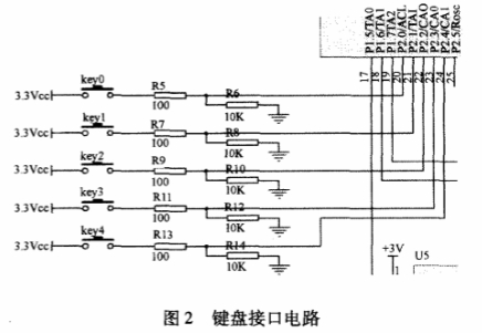 现场测量涡街流量计在使用时,需要根据不同管道直径、流体介质、温度、气压、黏滞系数等改变或修正相关参数,来计算体积流量或质量流量,所以仪表必须有可以现场修正的键盘。设计采用独立式键盘来修改相关参数值,键盘电路主要利用MSP430单片机的I0端口来进行设计。它的6组端口的每组8个IV0管脚可以单独设置成输人或者输出,且每个都可独立读写。如图2所示为键盘接口电路,,利用P2端口的每个管脚还可以单独设置为中断或只读口分别与P2.0~P2.4依次连接。按键功能分别是返回键、右移键、增1键、左移键、修改键。当修改键有按键动作时触发键盘中断,其它键按下不响应中断。当进人中断后按下其它任意键使得对应,P2口由100Q和1kn两个电阻对3.3V分压为高电平3V,弹起键时对应P2口为低电平0,以此作为键盘扫描判断。